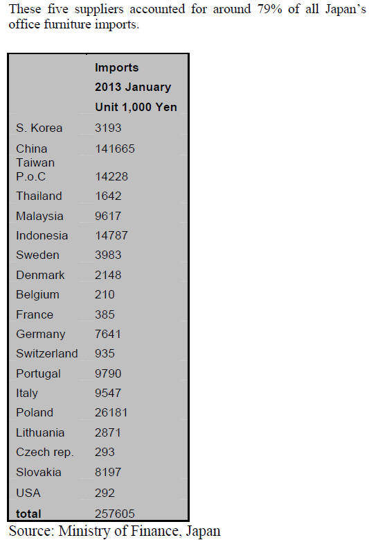 January 2013 imports of office furniture totaled Yen 2.6 bil. Up around 7%