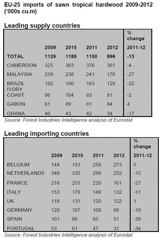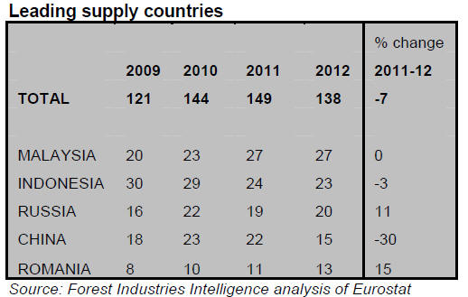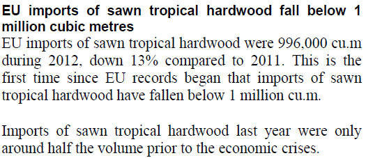 EU imports of tropical hardwood logs in 2012 were only 205,000cu.m, 30%