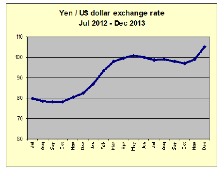 devaluation of the yen over 100 yen per dollar since late