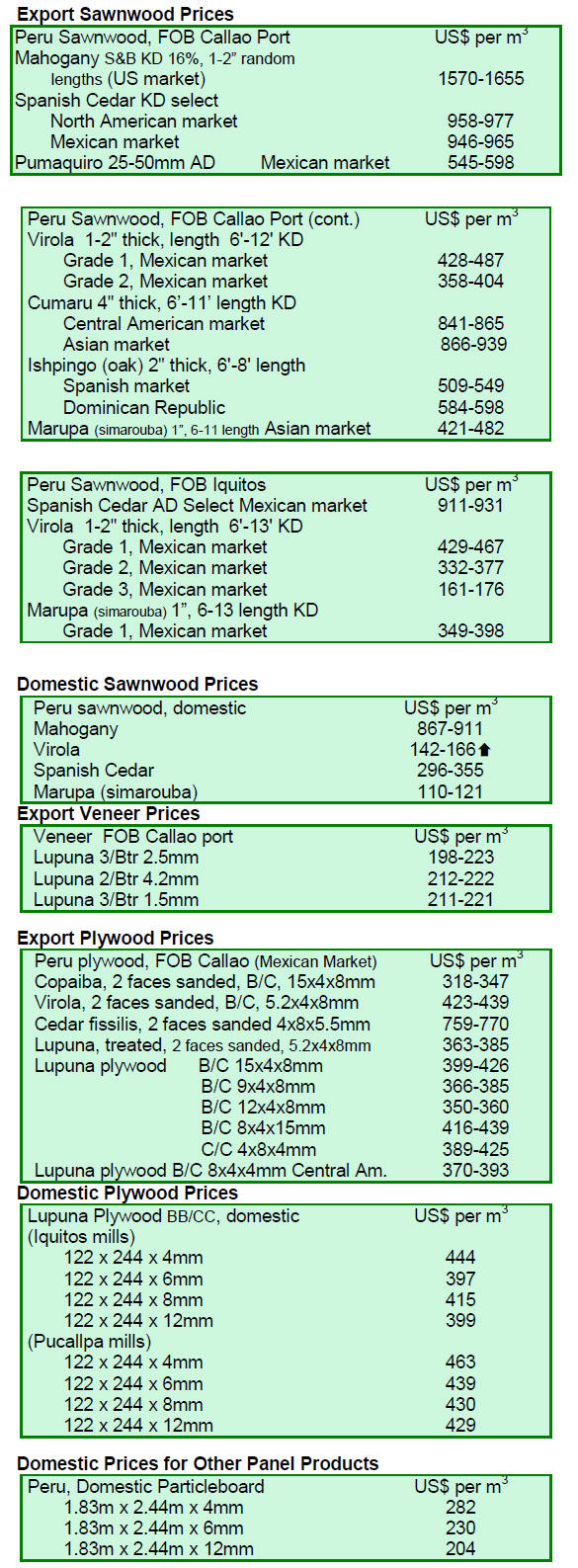 US$160 per cubic metre FOB; shibadan (Aspidosperma