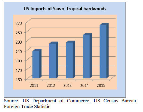 Imports of sapelli sawnwood grew 7% in 2015 to 41,392