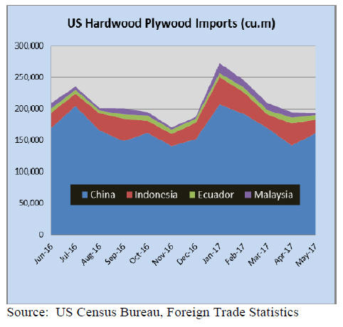 Plywood imports from China increased 14% in May to