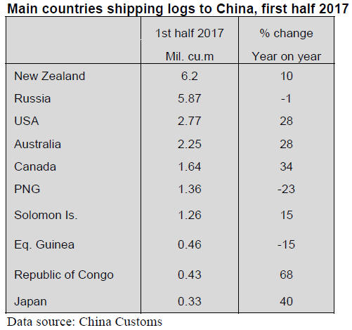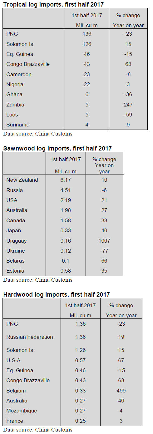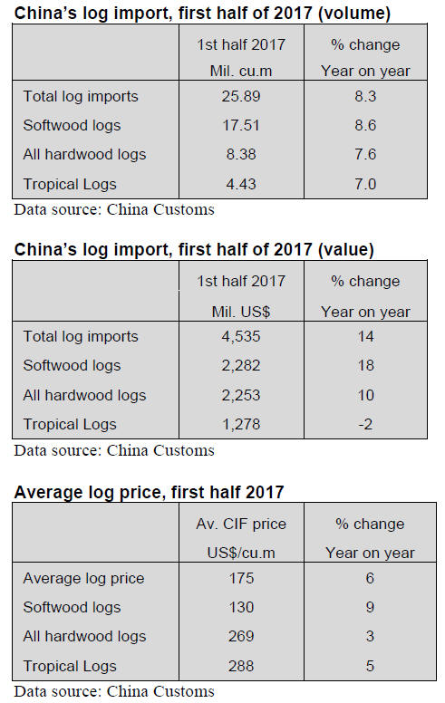 China¡¯s log imports in the first half of 2017 totalled 25.89