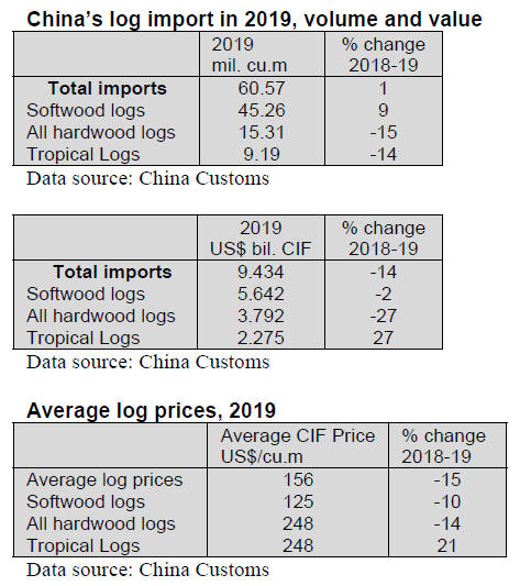 In 2019 hardwood log imports fell 15% to 15.31 million
