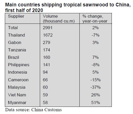 The top ten suppliers of tropical sawnwood to China in the