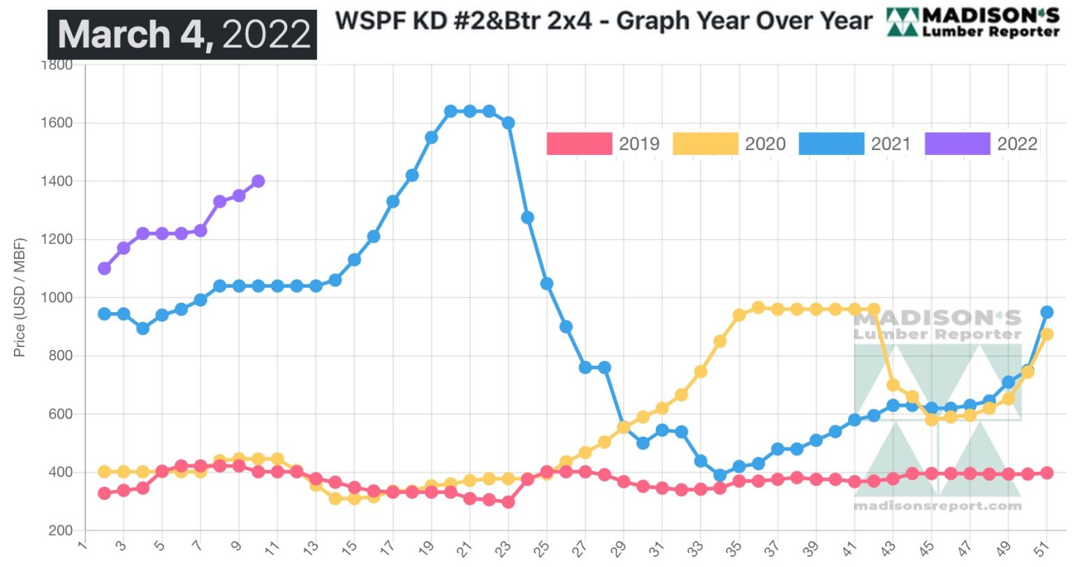 week ending March 4, 2022 the price of Western S-P-F 2×4 is up by +$360,