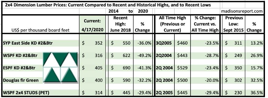current April 2020 benchmark dimension softwood lumber 2x4 prices