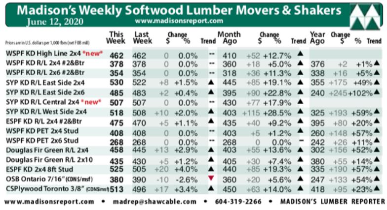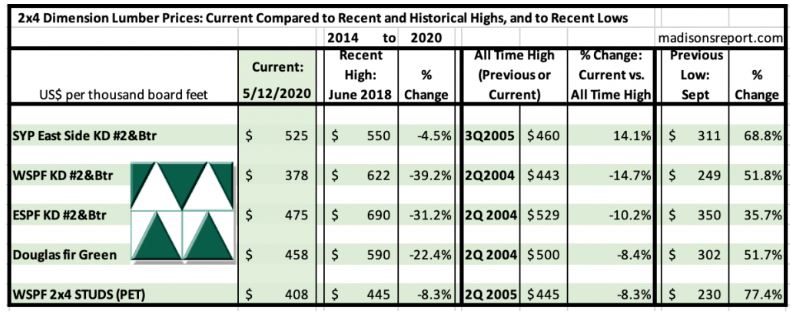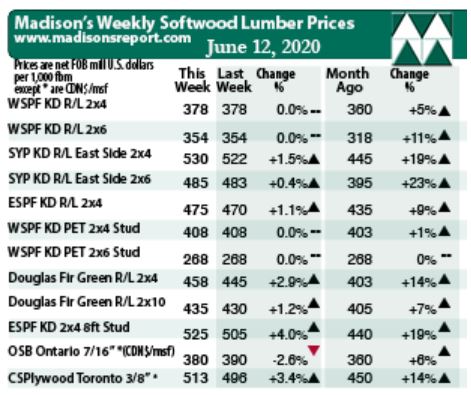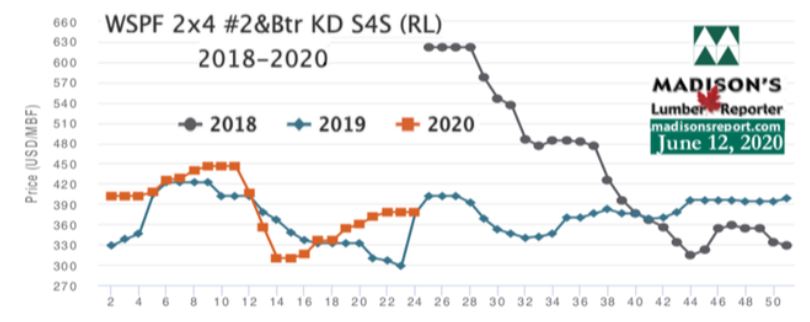 current June 2020 benchmark dimension softwood lumber 2×4 prices