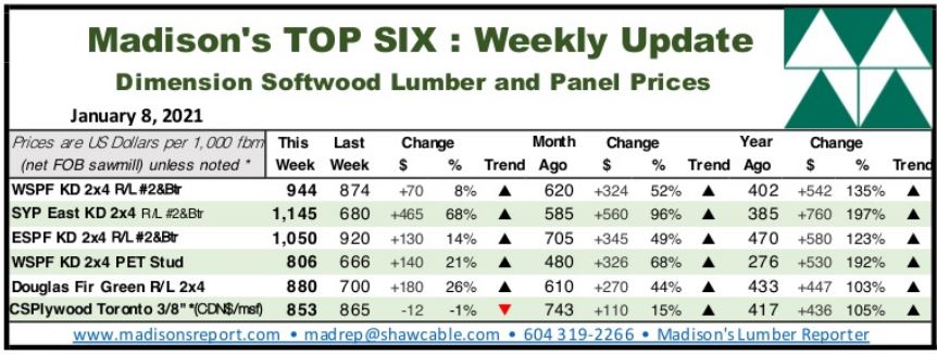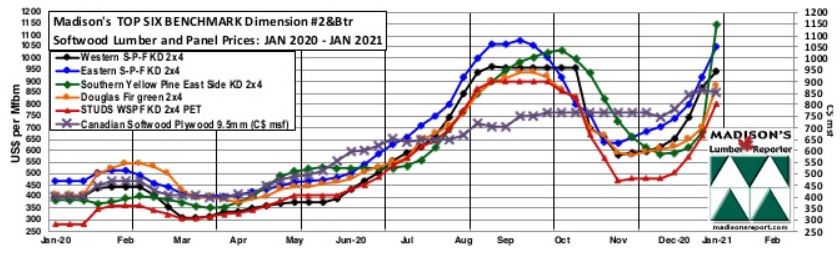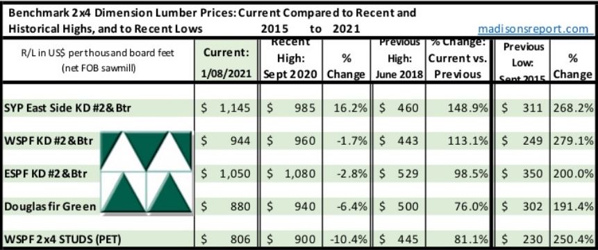current Jan. 2021 benchmark dimension softwood lumber 2×4 prices,