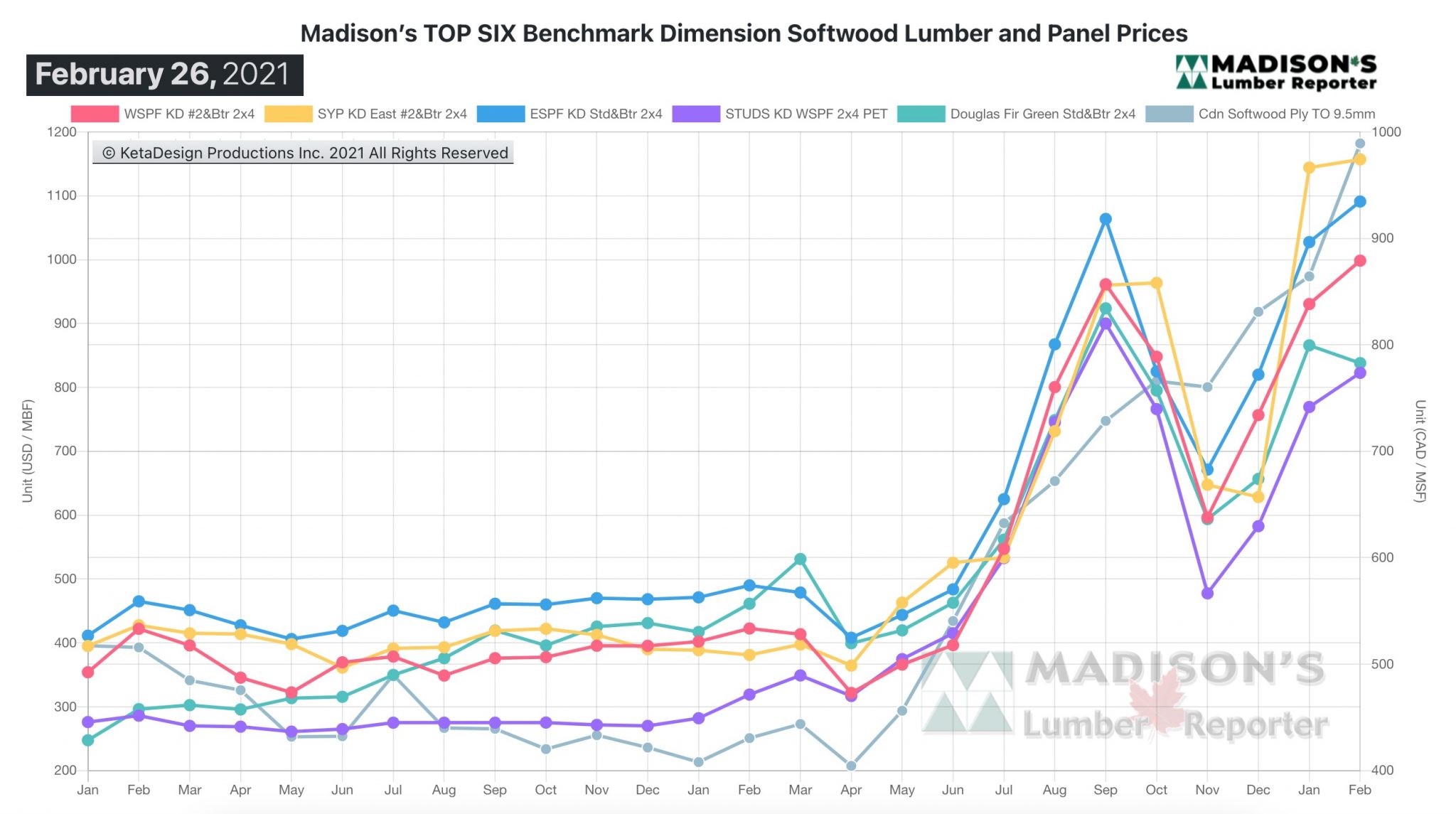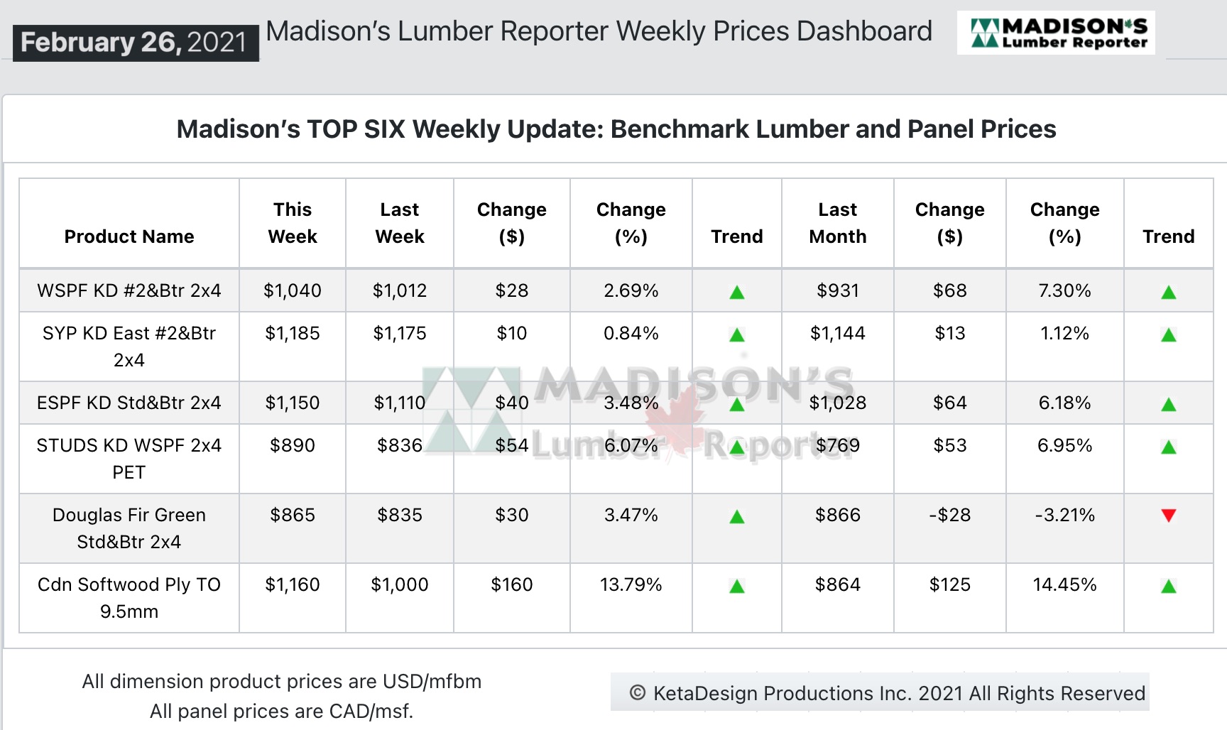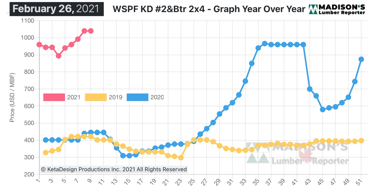 S-P-F KD 2×4 #2&Btr rose another +$28, or +3%, to US$1,040 mfbm,