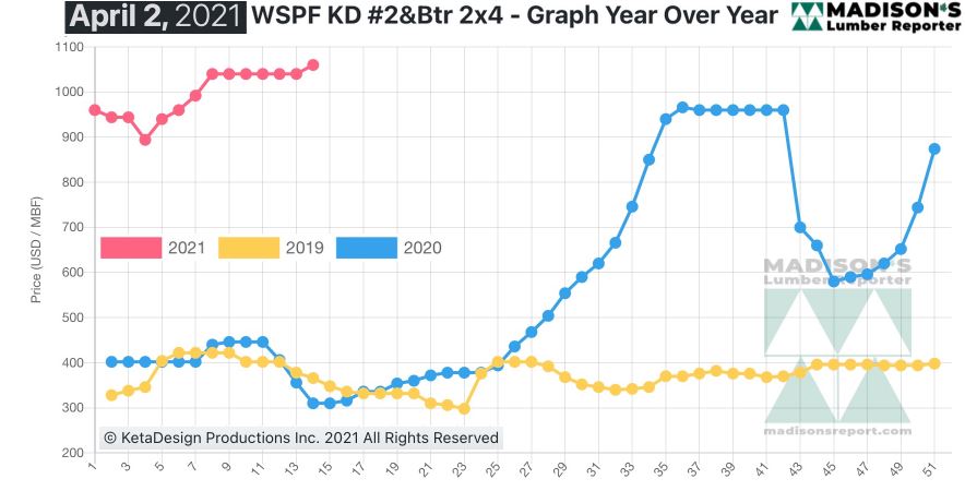 item Western S-P-F KD 2×4 #2&Btr was US$1,060 mfbm (net FOB
