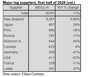 China’s log imports from Japan rose 29% to 897,000 cubic