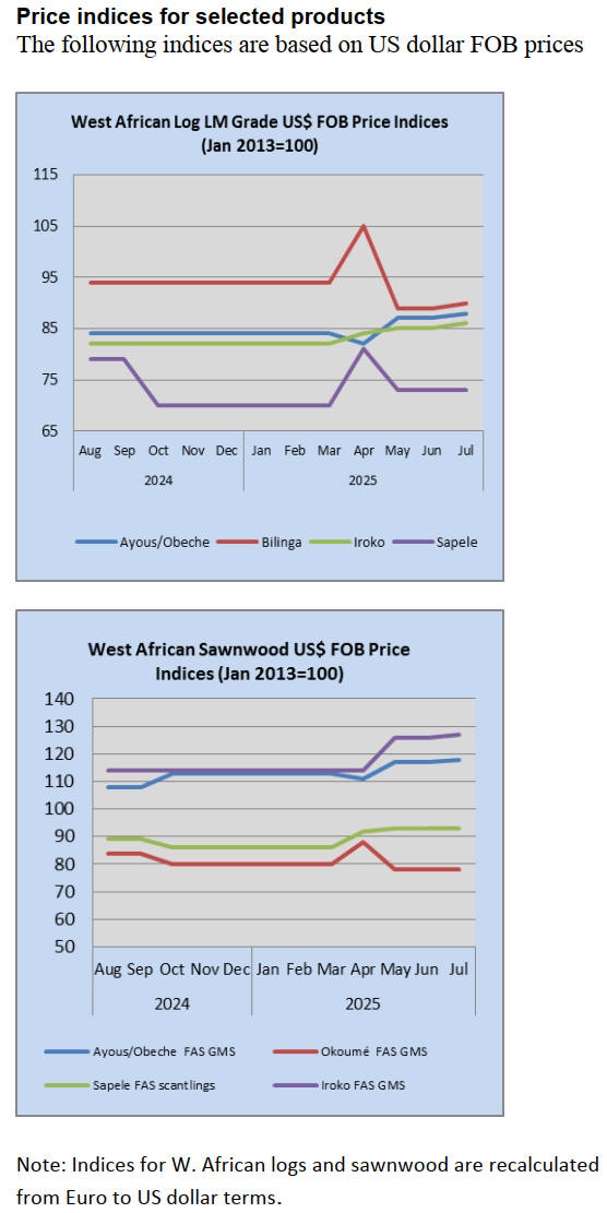 prices for sawn Okoume are steady at 140,000 CFA/pcbm.
