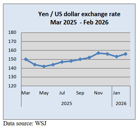 In February the yen/dollar exchange rate hit a 53-year low,