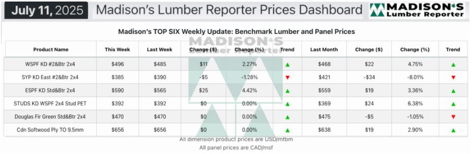 In the week ending July 11, 2025 the price of Western Spruce-Pine-Fir 2×4