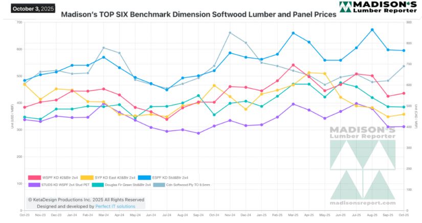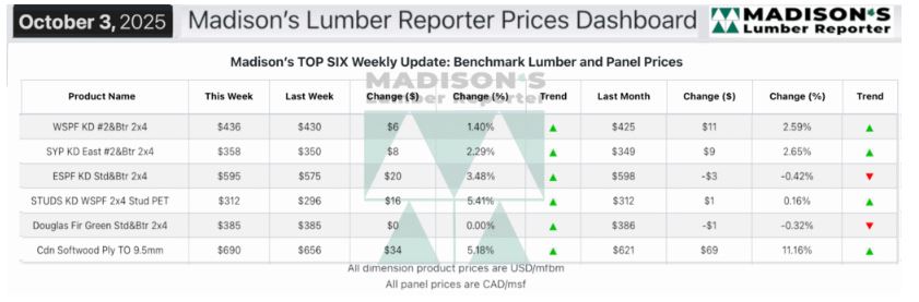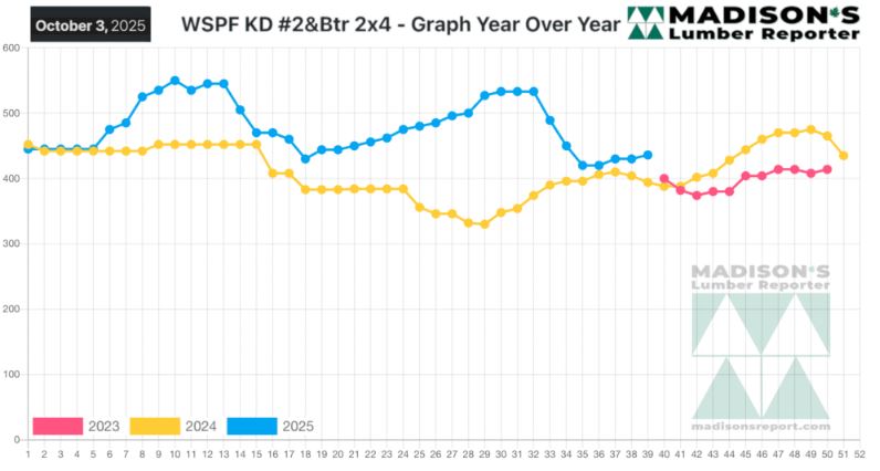 In the week ending October 3, 2025 the price of Western Spruce-Pine-Fir 2×4 #2&Btr KD (RL) was US$436 mfbm, which was up +$6, or +1%, from the previous week when it was $430, said weekly forest products industry price guide newsletter Madison’s Lumber Reporter.