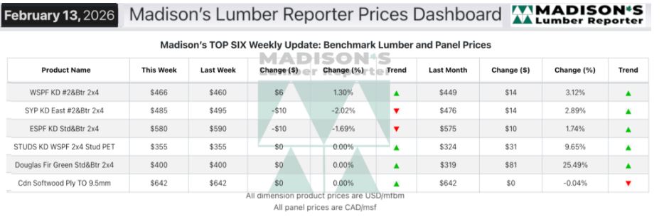 In the week ending February 13, 2026, the price of benchmark softwood lumber