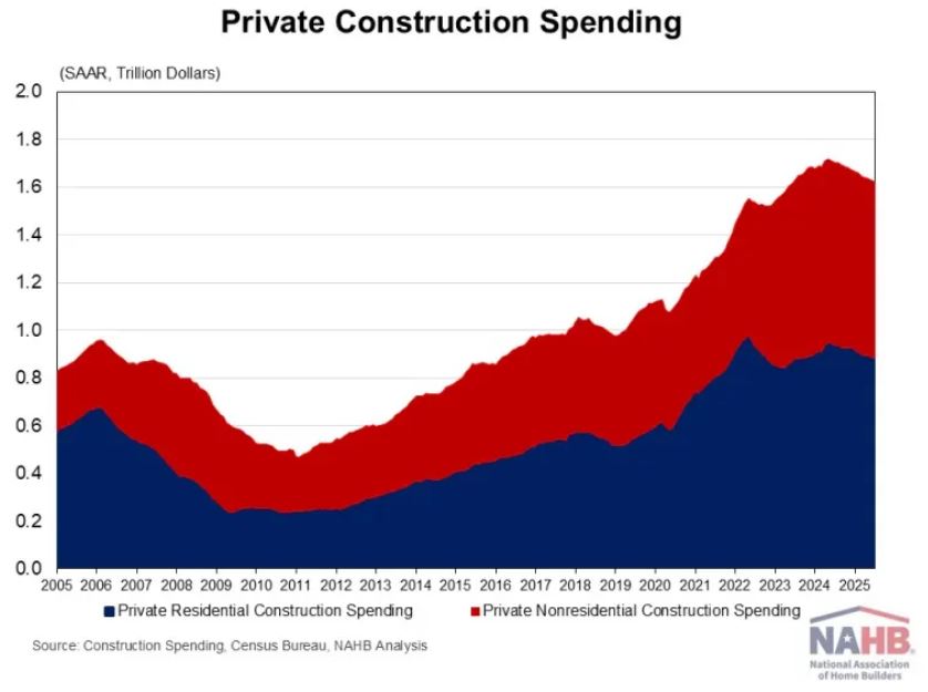 The NAHB construction spending index is shown in the graph below. The index illustrates how spending on single-family construction has slowed since early 2024 under the pressure of elevated interest rates and concerns over building material tariffs. Multifamily construction spending growth has also slowed down after the peak in July 2023. Improvement spending has also been weakening since the beginning of 2025.