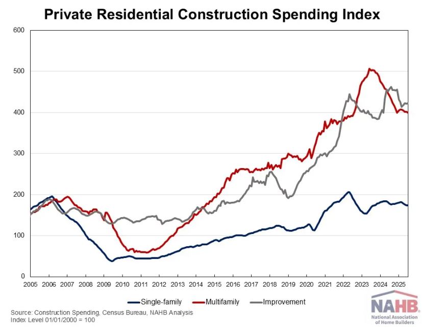 According to the latest U.S. Census Construction Spending data, single-family construction spending edged up 0.1% in June, in line with the slight improvement reflected in the July NAHB/Wells Fargo Housing Market Index (HMI). Compared to a year ago, single-family construction spending decreased by 2.1%. Improvement spending (remodeling) was up 0.1% for the month but remained 7.6% lower than in June 2024. Meanwhile, multifamily construction spending slipped 0.4% in June, continuing the downward trend that began in mid-2023. Compared to a year earlier, multifamily spending was down 9.4%.