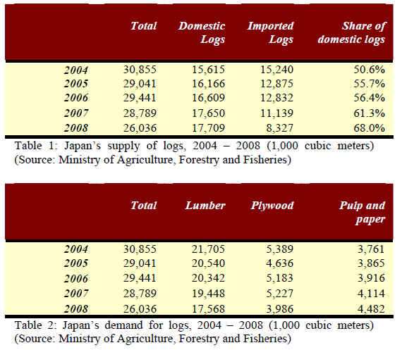below show the domestic supply of logs in Japan (Table 1)
