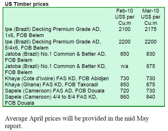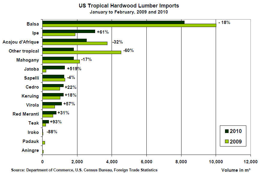 Year-to-date tropical lumber imports improved to some extent in February 2010. Especially imports of Ipe and Jatoba lumber from Brazil increased compared with the same time period in 2009. Imports of Acajou d¡¯Afrique were down by a third compared with year-to-date February 2009. Cote d¡¯Ivoire exported significantly less, but Acajou imports from Ghana increased by 80%.