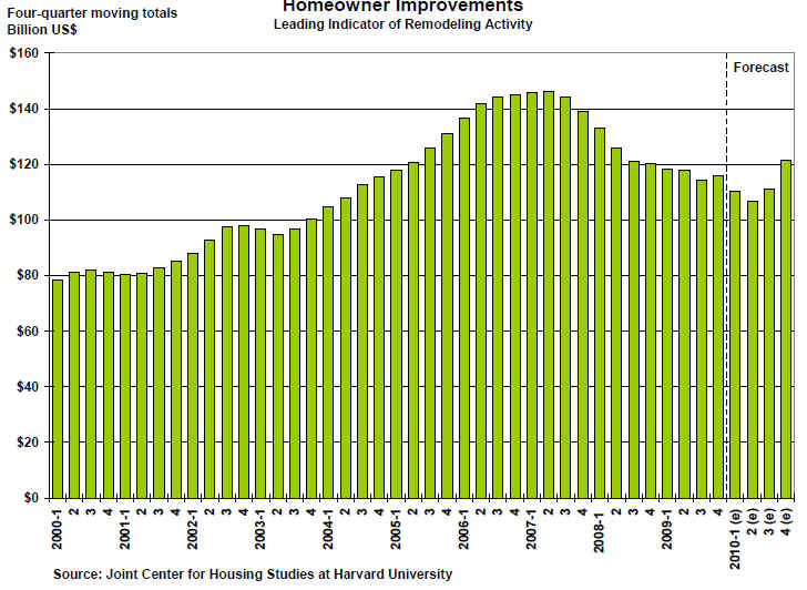 Homeowner improvement spending in the US is expected to grow by almost 5% in 2010. The Leading Indicator of Remodeling Activity by the Joint Center for Housing Studies at Harvard University shows that spending on remodeling will recover this year. Spending on renovation projects is expected to be US$ 106.5 billion in the second quarter of 2010 and rise to US$ 121.5 billion by autumn. Home improvement spending will benefit from the increase in home sales and in the longer-term, by the gradual recovery of the US economy.