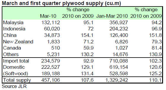 Imports from Malaysia and Indonesia dropped while imports from China increased considerably. First quarter imports of plywood from China were up by more than 50% compared to the level in the first quarter 2009.