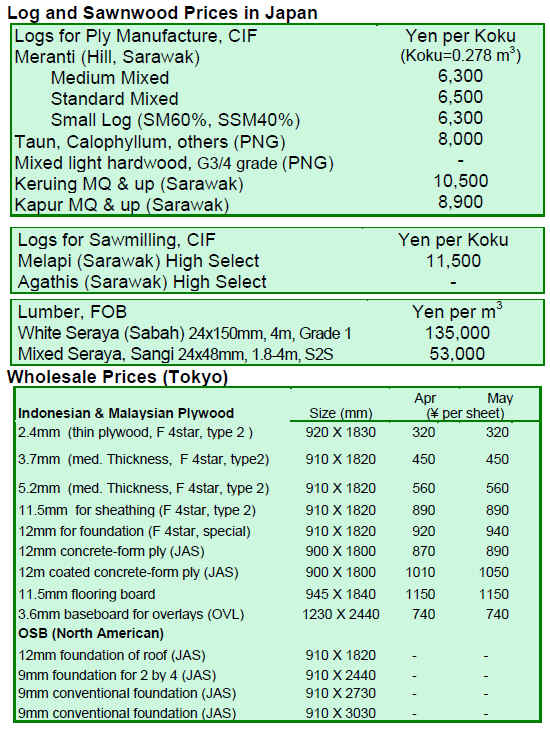 Importers are proposing a price of Yen 900 per sheet delivered for 3x6 concrete formboard while the market level is still hovering around Yen 880-890 per sheet.
