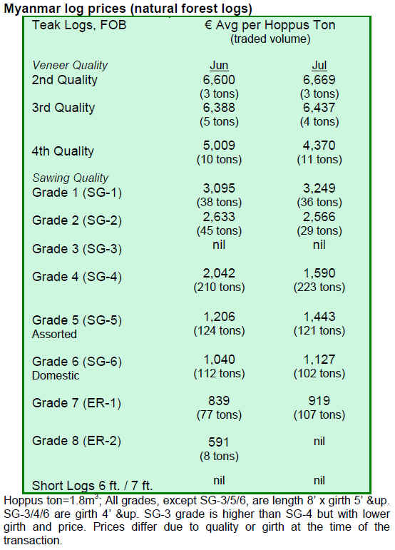 The market for pyinkado and Gurjan logs remains weak. These species are facing strong competition from similar species from Indonesia and Malaysia.