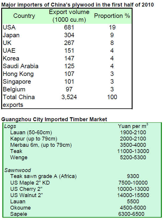 Plywood: A total of 3.52 million cu.m of plywood were exported in the first half of 2010, valued at US$1,583 million, up 47% in volume and 44% in value from the same period last year.