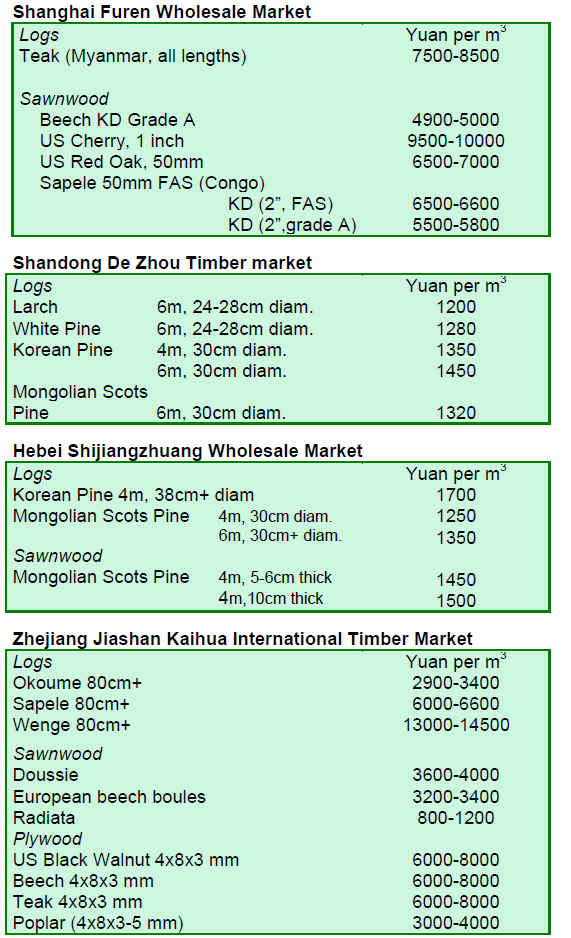 During the first half of 2010, there were five provinces that imported more than one million cu.m of logs each: Jiangsu Province, Inner Mongolia Autonomous Region, Heilongjiang Province, Shandong Province and Shanghai Municipality.