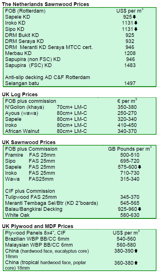 UK tropical sawnwood demand more upbeat than continental Europe The market situation varies to some extent by species. Stocks and forward availability of iroko sawnwood are now extremely tight with the result that prices are tending to rise. In contrast, stocks of sapele are generally regarded as relatively high compared to demand, with the result that prices (both FOB and for onward sales in the EU) have been weakening. CIF North Europe prices for Malaysian meranti sawnwood have remained steady and are now at very similar levels to those for sapele, a species with which it competes in many market sectors. Prices for other key tropical hardwood species such as ayous, wawa, and sipo have also remained stable in recent weeks. Some of the larger European decking importers have been visiting suppliers in South East Asia in recent weeks and are reported to be buying in larger volumes than last year. This seems to be more due to improved availability and better terms of trade than to rising confidence that European consumption is strengthening. While still difficult, the log supply situation is manageable in South East Asia and decking products may be ordered for fairly prompt shipment. European agents are reporting that demand for tropical hardwood decking products remains relatively slow, with many importers determined to maintain stocks at low levels at least until after the New Year. But there is some expectation that forward orders will pick up within the next few weeks, particularly as the Euro has continued to strengthen against the US dollar.