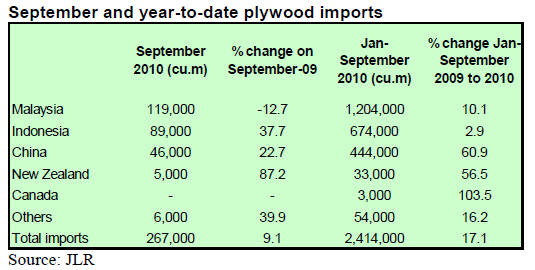 According to JLR, plywood consumption in Japan during September was 499,600 cu.m, up 10% from September 2009, but 1.3% less than recorded in August 2010.