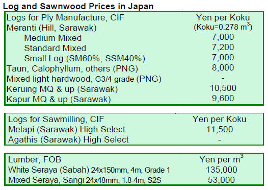 In Sabah, kapur log prices fetched US$270 per cu.m, up US$2-3 per cu.m from October. Sabah keruing log prices stood at US$247 per cu.m for regular and US$270-280 per cu.m for sawmill quality (diameter 70-80 cm & up).