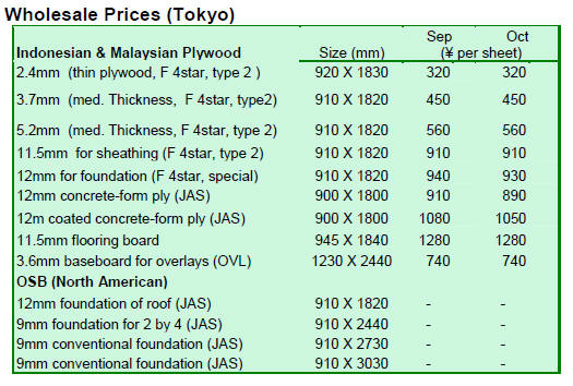 The average market price for imported 3x6 concrete formboard is Yen 880-900 per sheet delivered. Prices for 3x6 coated concrete formboard are at Yen 1,030 per sheet and for 2x6 at Yen 730-740 per sheet, Yen 10-20 per sheet and Yen 20 per sheet lower compared to October respectively.