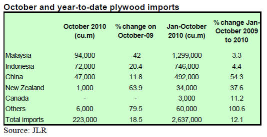According to the JLR, log shortages at the ports in Malaysia are severe and many ships are waiting for cargos. This, in turn is driving up demurrage and total shipping costs. Shipping companies are now asking US$47-48 per cu.m, up US$1 per cu.m from November. According to importers, loading time is normally one week, but due to log shortages it is currently 10-14 days. In Sabah, log export prices at Tawau port for mix serayah logs are at US$230-235 per cu.m FOB, up US$5-7 per cu.m from November. White serayah log prices fetched US$250 per cu.m FOB. Kapur prices gained US$5 per cu.m from a month ago to US$275-280 per cu.m FOB, while keruing log prices jumped US$20 per cu.m to US$260 per cu.m FOB. Keruing log prices for sawnwood (70-80 cm & up) fetched US$275-285 per cu.m FOB. In Sarawak, meranti regular log export prices at Tanjonmani port are at US$245 per cu.m FOB, gaining US$10 per cu.m from a month ago and US$65 per cu.m (up 27%) from the beginning of the year. Small meranti prices are at US$210 per cu.m FOB, up US$70 per cu.m (up 34%) from the beginning of the year, however, current asking prices are closer to US$215 per cu.m. Kapur log prices are at US$300 per cu.m FOB. According to JLR, the Japanese market for hardwood logs is firming after frenetic buying due to the strong Yen in recent months. In addition, some manufacturers have been rebuilding their stocks ahead of the rainy season in producer countries. Currently, the appreciation of Yen has eased but CIF prices have trended upwards since early November. Plywood mills in Japan utilising imported tropical hardwood logs have maintained their reduced production levels at around 70% of full capacity for more than a year. In Japan, CIF prices gained Yen 100 from November to Yen 7,200-7,300 per koku for Sarawak meranti regular logs and to Yen 6,100-6,200 per koku for small meranti logs. Super small meranti log prices stood at Yen 5,800-5,900 per koku, unchanged from November. Sharp fall of plywood imports from Malaysia October plywood imports amounted to 223,800 cu.m, the lowest level this year and around 40,000 cu.m less than the monthly average during 2010. The major cause for the overall fall is that plywood imports from Malaysia plummeted 42% compared to October last year. According to JLR, the main factors for the curtailed plywood supply are the log shortage and the appreciation of Malaysian currency against the US dollar. However, October plywood imports from Indonesia amounted to 72,000 cu.m, up 20.4% compared to October last year.