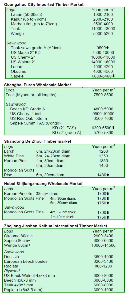 In terms of imported volumes, Canada was the major supplier overtaking New Zealand which was the largest supplier last year. Other imports originated from the US, the Philippines and Australia. In the first three quarters of 2010, timber imports from Canada totalled 1.17 million cu.m, up 55% over the same period last year. Spruce sawnwood and Douglas fir logs were the main imported timber products. The average unit price was US$168 per cu.m, up 29% from last year. The unit price rise was more moderate for Canadian timber than for New Zealand timber, which was the main reason for the sharp increase of Canadian timber imports. Timber imports from New Zealand amounted to 875,000 cu.m in the first thee quarters of 2010, down 4% from the same period last year. Radiate pine logs were the main imported products. The average unit price was US$137 per cu.m, up 55%. In the first three quarters of 2010, timber imports from US surged 162% compared to the same period last year, amounting to 514 000 cu.m of timber. The average unit price was US$349 per cu.m, increasing 29% over last year. Timber imports from Australia totalled 242,000 cu.m in the first three quarters of 2010, 14% more than in the same period last year. Nearly 90% of imported timber was radiate pine logs. The average unit price was US$162.3 per cu.m, up 30%. Timber imports from the Philippines amounted to 319,000 cu.m in the first three quarters of 2010, a 103% jump over the same period of last year. Batai sawnwood (Aibizia falcataria) were the main imported species. The average unit price was US$98.4 per cu.m, increasing only slightly by 5%. According to analysts, the plywood export recovery resulted in improved demand for peeling quality logs from Chinese plywood manufacturers. Besides the five countries mentioned above, timber was imported through Shanghai from Indonesia (166,000 cu.m, up 111%), Russia (91,500 cu.m, down 13%), Germany (90,700 cu.m, up 107%), France (63,200 cu.m, up 172%), Malaysia (53,000 cu.m, up 16%), Brazil (37,000 cu.m, down 2%), Finland (18,000 cu.m, up 111%), Belgium (28,000 cu.m, up 180%) and Romania (18,000 cu.m).