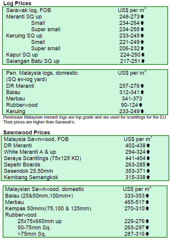 3. MALAYSIA Korea imposes anti-dumping duties on Malaysian plywood Anti-dumping duties have been imposed on eight Sarawak plywood suppliers including Subur Tiasa Plywood Sdn Bhd with the anti-dumping duty of 5.12%, while the duty of 6.43% was imposed on Jaya Tiasa Timber Products Sdn Bhd, Hwa Sen Veneer and Plywood Industry Sdn Bhd. An anti-dumping duty of 9.75% has been imposed on 5 companies of the Shin Yang group: Shin Yang Plywood Sdn Bhd, Forescom Plywood Bhd, Menawan Wood Sdn Bhd, Shin Yang Plywood Bintulu Sdn Bhd and Zedtee Plywood Sdn Bhd. The highest anti-dumping duty of 38.1% has been imposed on Sabah-based Sinora Sdn Bhd while the duty on all other Malaysian plywood manufacturers and exporters has been set at 8.76%. The variation in the imposition of the anti-dumping duties is due to the different selling prices and types of wood used. This is the first time anti-dumping duties have been imposed on Malaysian plywood in the international markets. Republic of Korea imported 530,000 cu.m of panel products from Sarawak in 2010, worth RM570 million. High price levels retained The other factor pushing prices higher is the continuing strong demand from China and India. China¡¯s demand for logs has increased worldwide since Russia, China¡¯s largest log supplier, imposed an export tariff on log exports. India¡¯s demand may be attributed to a steady rise in corporate capital expenditure for most part of 2010. This rise in corporate capital expenditure is expected to continue into 2011. Prices of plywood from Sarawak surged 8% to 14% in 2010 on the back of sustained demand from Japan which increased 12.1% in the first 10 months of 2010 compared to the same period in 2009. Plywood manufacturers are also optimistic that 2011 will be a profitable year if the current price levels are maintained or improved. Plywood manufacturers are optimistic that the housing starts in 2011 in Japan will be strong enough to support current price levels. The Japan housing starts in 2010 rose 20.4% in August, 17.7% in September and 6.4% in October, vis-¨¤-vis the same months in 2009. Building permits for October 2010 increased by 3.4% compared to the same month in the previous year. However, the housing starts and building permits in 2010 in Japan remained far behind the levels recorded in 2008. In support of the local timber industry, the Sarawak Forestry Department is likely to extend the 50% log export quota which is expiring in mid-2011. Malaysian exporters seek market opportunities in India Malaysian timber producers are planning new ventures and investments in India to increase their market share in the Indian market.