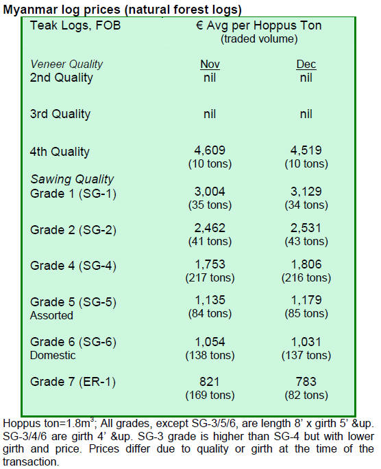 to local manufacturers Active auction sales in government depots Since prices of imported teak are increasing, the impact on depot sales is also apparent. Prices were up by 15% to 20% compared to previous auctions. Long length teak logs fetched Rs.2000-2200 per cu.m, medium quality Rs.1500-1700 per cu.m and lower grades were priced at Rs.900-1000 per cu.m. The hardwoods like Adina, Laurel and Pterocarpus marsupium (kinowood) fetched Rs.800-850 for select qualities and Rs.325-400 for lower grades. Demand is good for these species, but supplies are very limited due to conservation and effective control by the Forest department. Kerala afforestation programmes receive UN