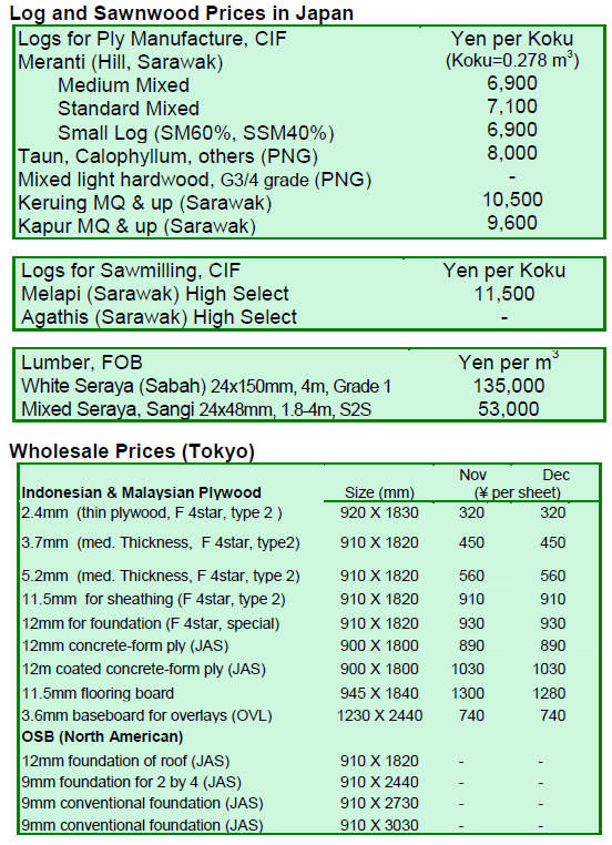 Manufacturers are retaining a bullish stance on pricing as log supplies are tight in Malaysia. Prices for imported 3x6 concrete formboard are now Yen 930 per sheet delivered. Prices for 3x6 coated concrete formboard remained at Yen 1,040 per sheet delivered, despite declining inventories.