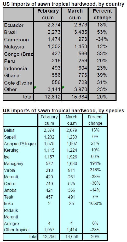 imports increased by 131% from February, to 78,403 cu.m., while tropical