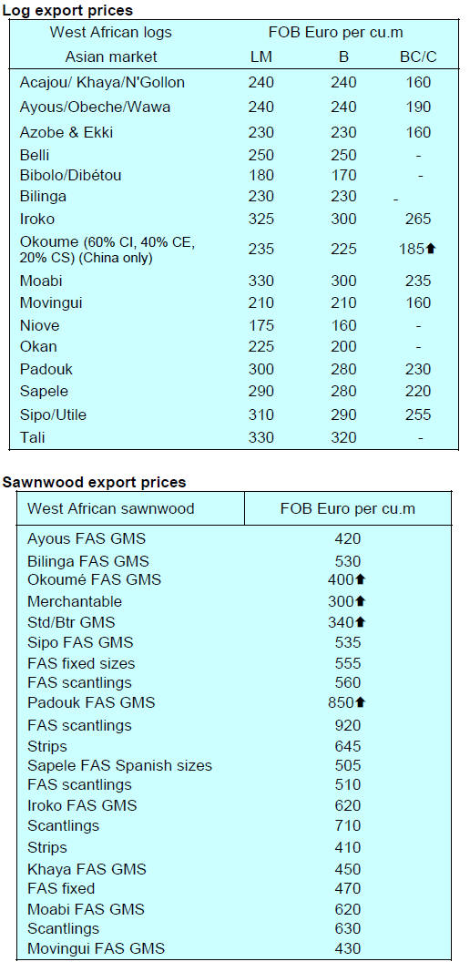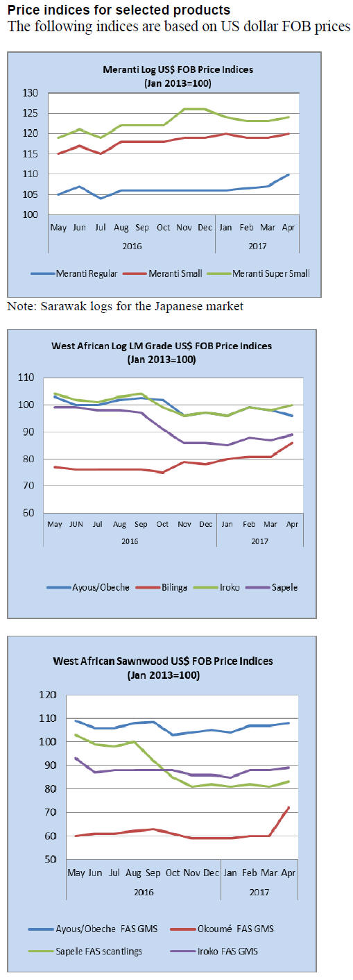 Tropical sawnwood exports fell 4% from 36,100 cu.m in