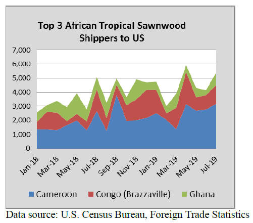 US imports of sawn tropical hardwood rebounded in July from a weak June, climbing 18% by volume from the previous month. Imports rose to 21,419 cubic metres in July, a volume approximately 8% higher than that of July 2018. Import volume is ahead of 2018 by 22% year to date.