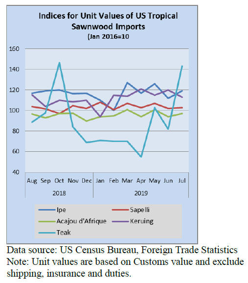 Imports of teak, acajou d¡¯Afrique, vVirola, pPadauk and keruing all rose sharply in July and are well ahead of 2018 volume year to date.