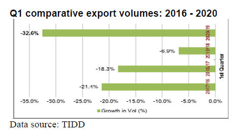 million), the volume and value of exports were down by a