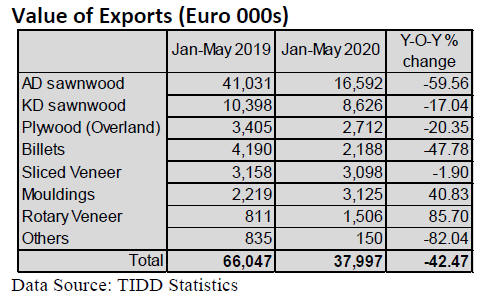 In contrast, exports of MDF in April fell just 2% to 38,366