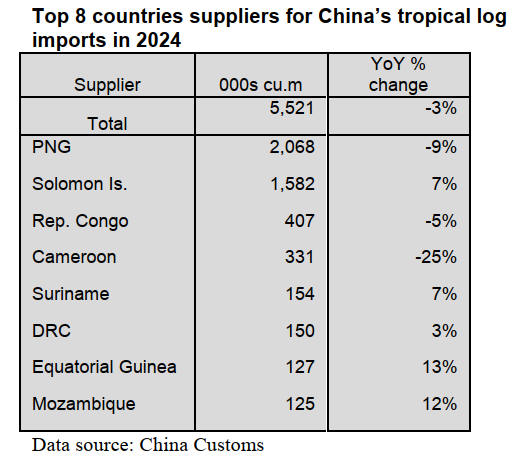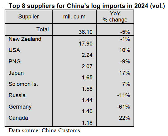 Hardwood log imports in 2024 rose 1% to 9.98 million