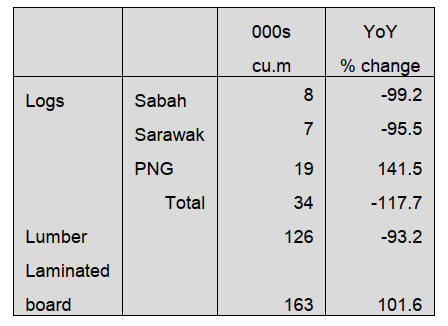 less and from Malaysia is 31,848 cbms, 8.4 % less than the