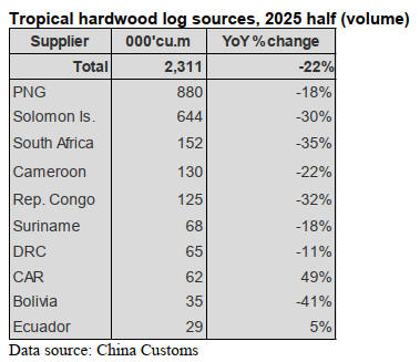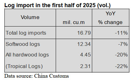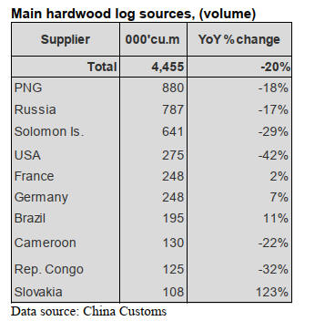 Hardwood log imports dropped 20% to 4.45 million cubic