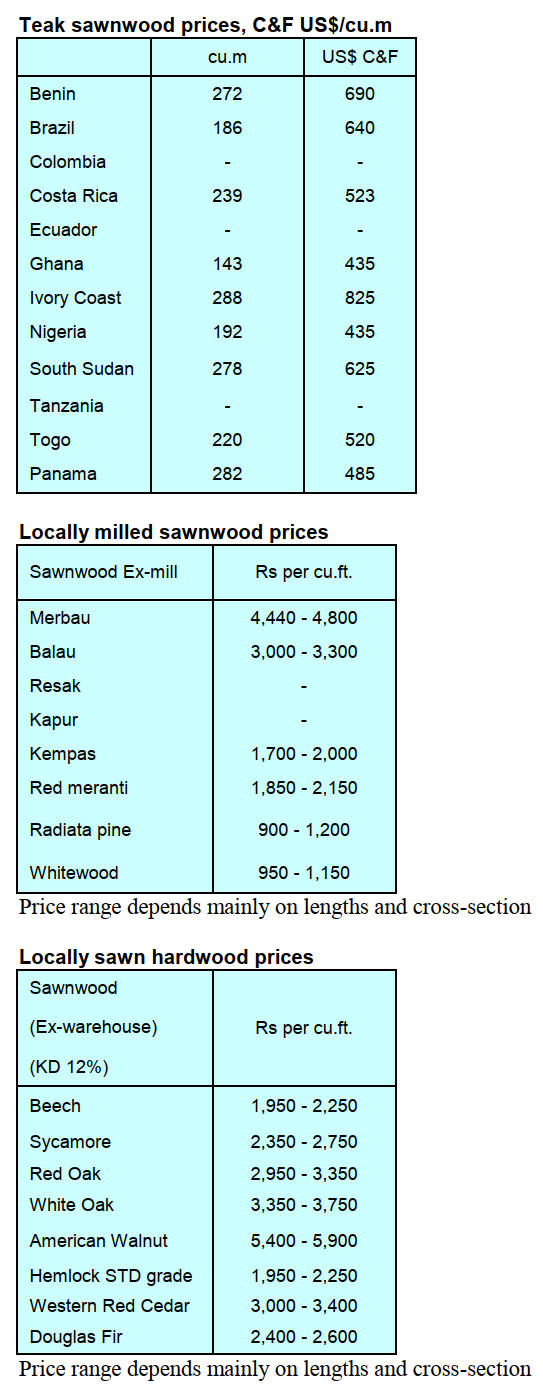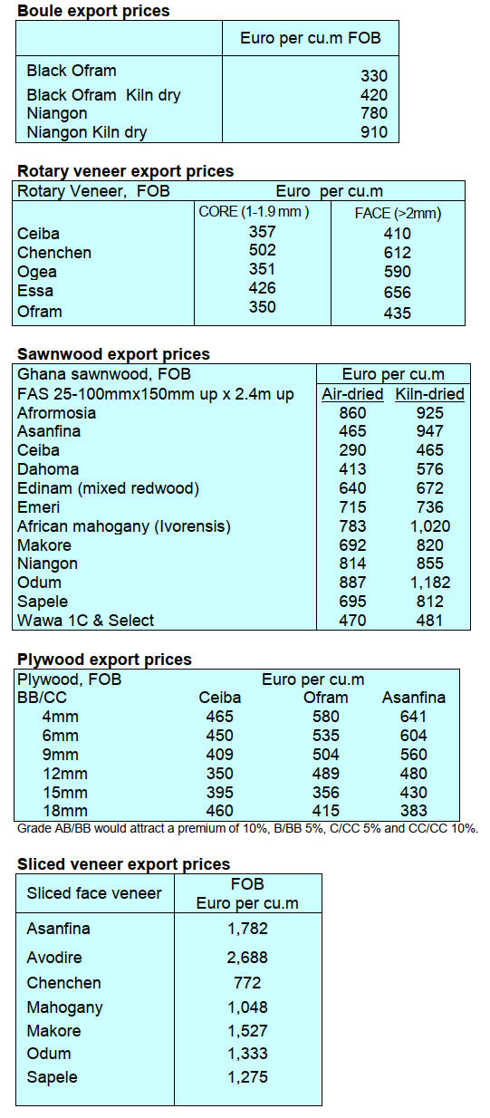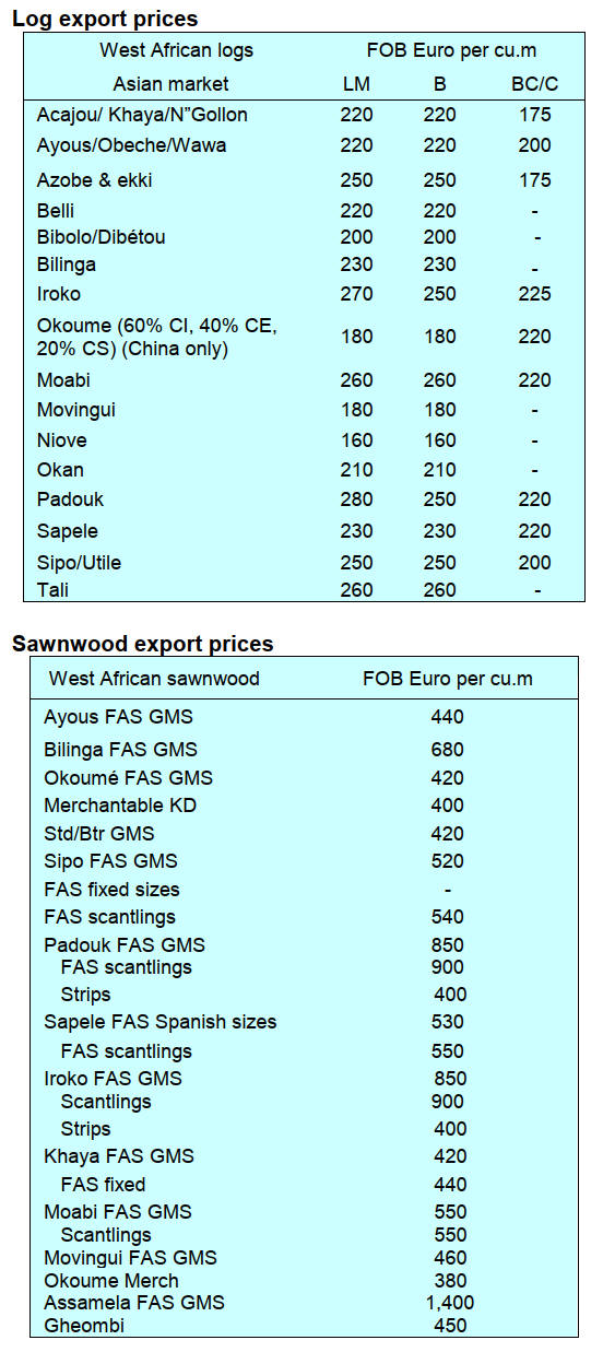 prices for sawn Okoume are steady at 140,000 CFA/pcbm.